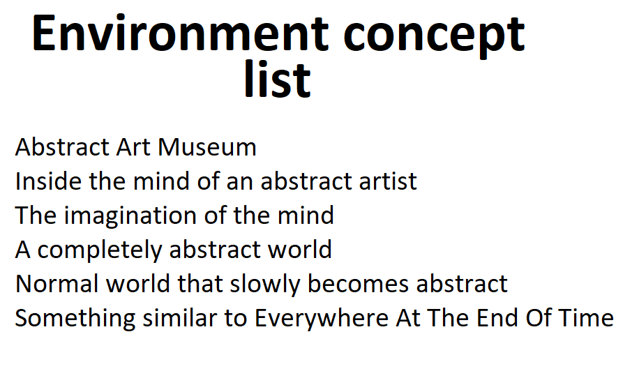 A similar overlapping occurs with the final two potential environments, being a normal world that slowly becomes abstract, and something similar to the album “Everywhere At The End Of Time”. Both of these would be quite demanding, in having the environment change over time, likely having several different kinds of environments just bleeding into each other in order to make an immersive experience. Though the main concern with that kind of environment mainly comes from the latter idea, being ethical concerns if it was based on something similar to the album “Everywhere At The Time”. I mainly expressed these concerns, as the album in question, describes itself as:
