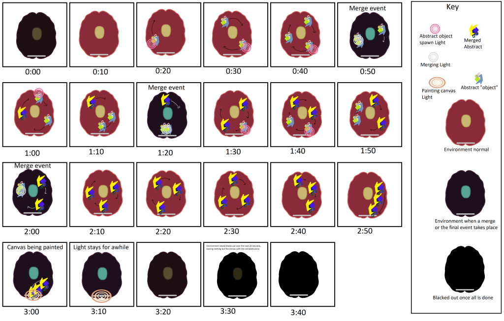 I thought of this special interaction as it would allow for me to make the video a lot more interactive and impactful rather than just having the abstract objects spinning around for a while before merging onto the canvas without having really any sort of change, so having not only the environment change colours, but also have a source of light, would not only have it be a more impactful experience, but also could symbolise the brain of an abstract artist piecing together the final art work that they are going to create and paint onto the canvas at the end of the video.