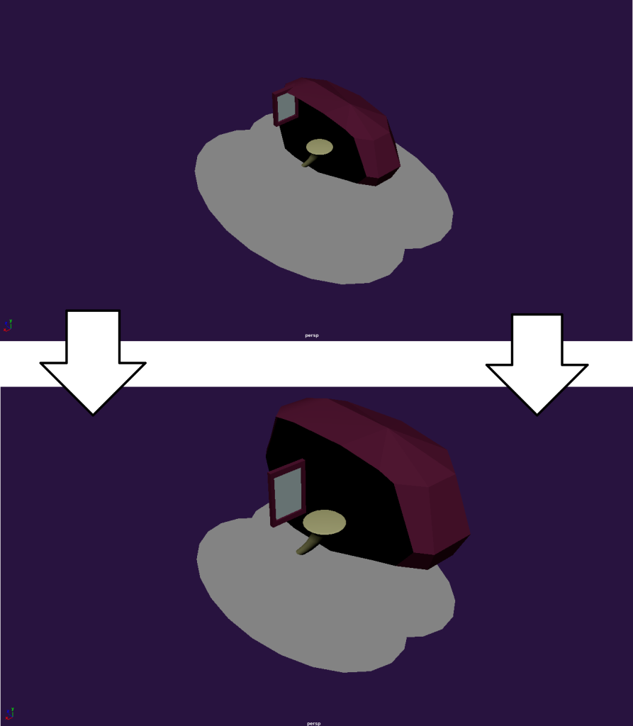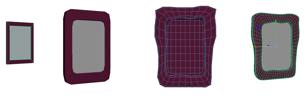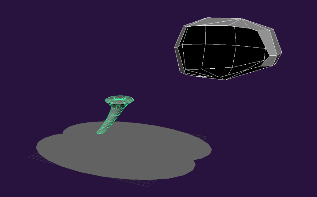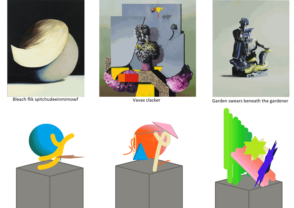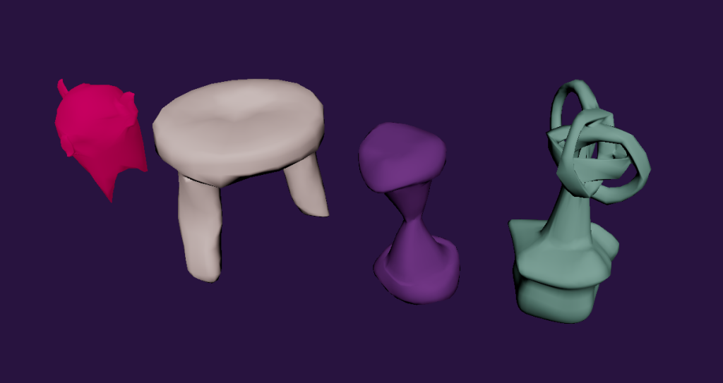 Most would be made out of using a base object, pulling at the various vertexes around the object in various ways (either through directly moving them, to rotating them, recalling them, etc), and then applying a smooth effect to them just once as to make them not look as jagged and low poly. Then they would be duplicated and merged with other objects as to loosely create objects that exist in the real world just enough to make the user think they know what their looking at. A total of 6 of these abstract objects would be created in total, one of which would take direct inspiration from another one of Ivan’s paintings, being “beaten frowns after”