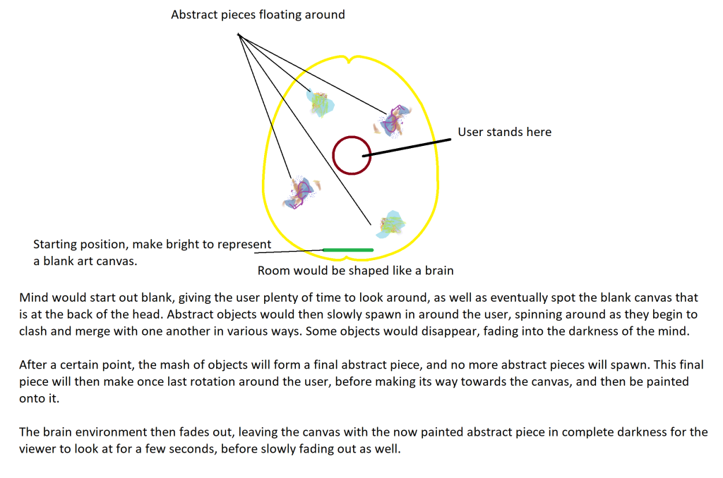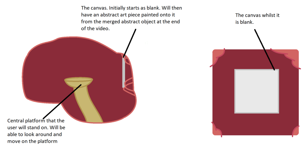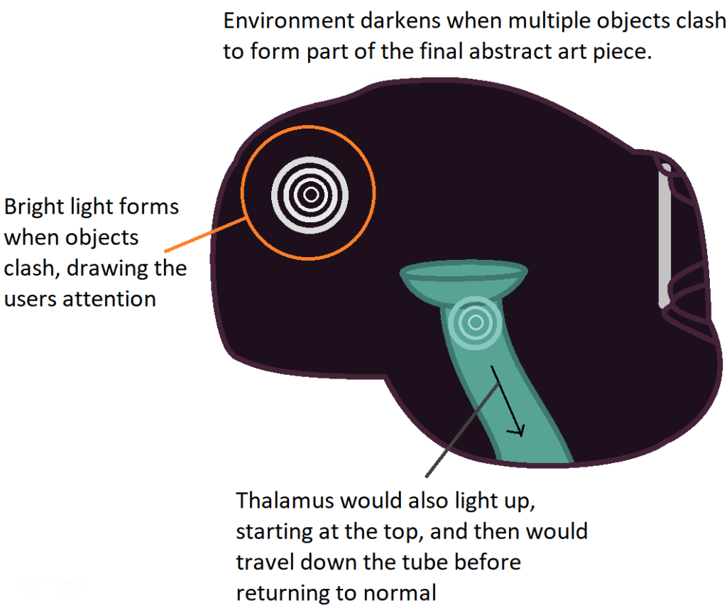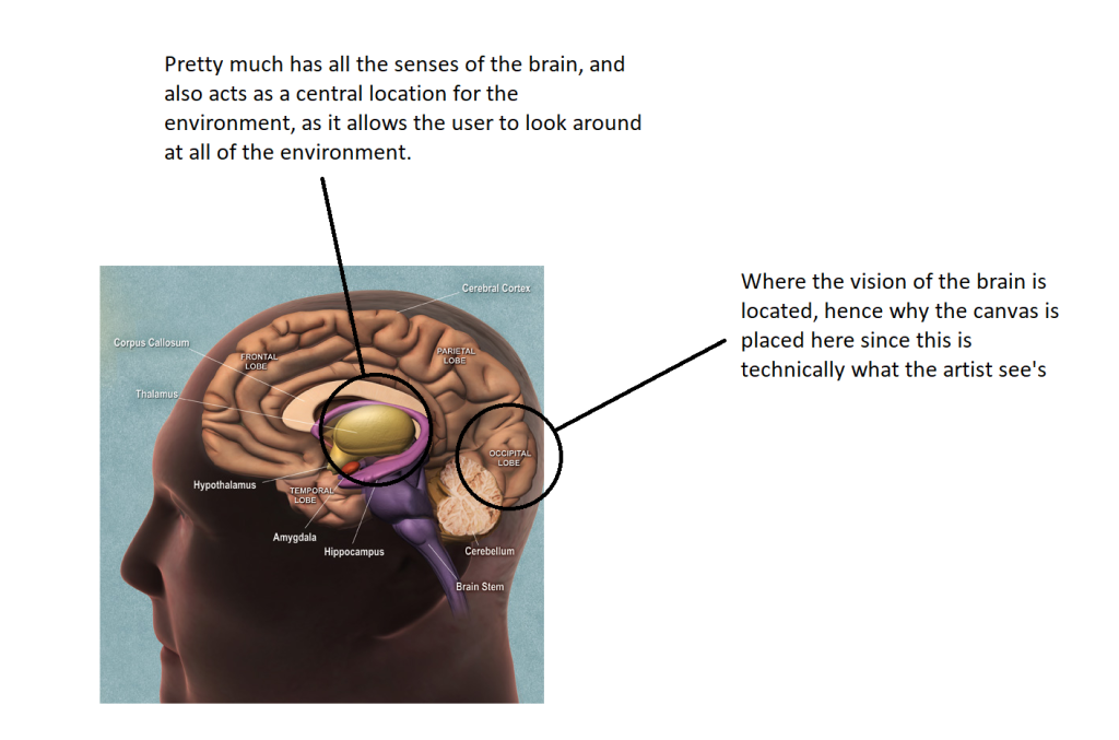I was satisfied with these designs, not only because they were what I was looking for in terms of an environment, but they also in a sense, lined up properly with the functions of an actual brain. For example, the canvas in the environment, would be located at where the back of the brain is. This location was chosen in particular as this is where the occipital lobe is in a normal brain, which is what allows a person to observe and see the world using their eyes, hence why the canvas was placed at the back of the brain environment.