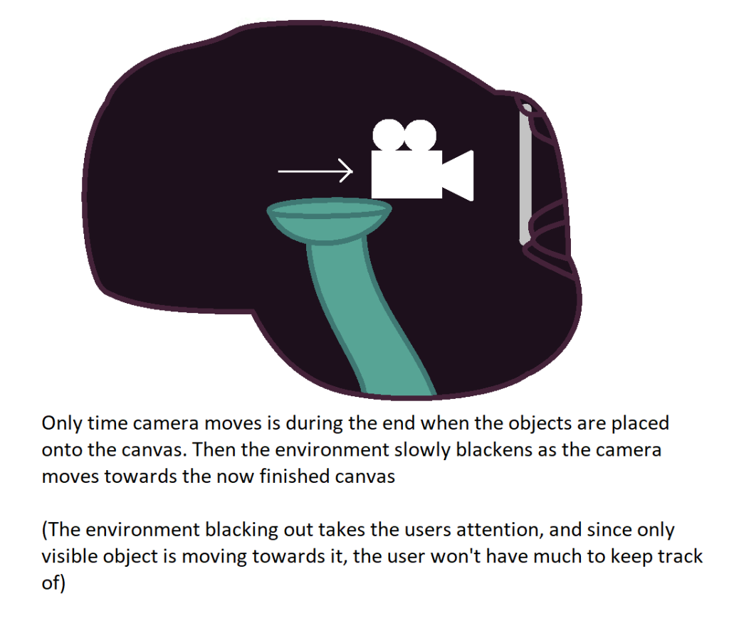 I decided to ensure as to avoid as many of these issues as possible, camera movement would be kept to a minimum, and it would remain stationary throughout most of the experience, with the only form of movement being towards the end, where it would zoom in on the now completed abstract art piece.