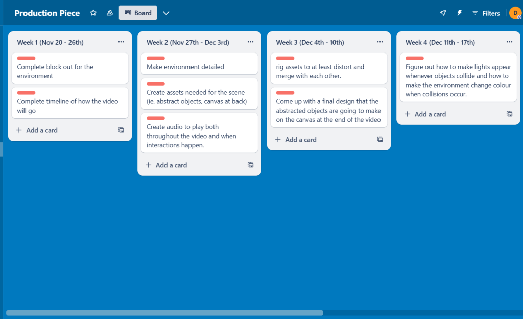 With the block out now sorted out and done, I could move onto the next item on the trello board that I set myself to do for this week, that being the storyboard timeline of how the video will play out.
