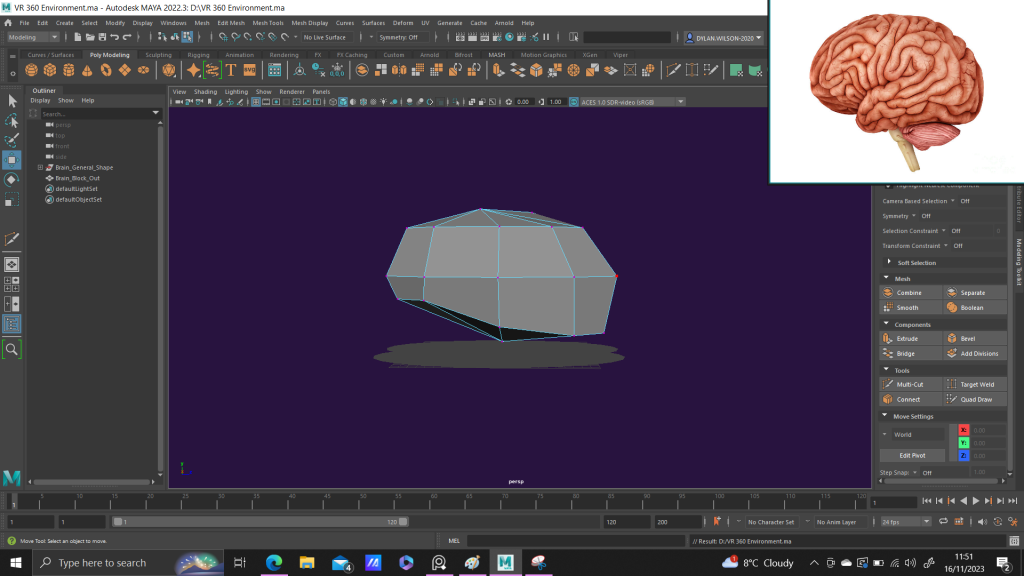 With the size now confirmed and in place, I began the block out stages by first making the sphere into a low poly model, and then adjusting the nodes of the sphere into the rough general shape of the brain. This sphere would then be duplicated and then flipped as to save time on creating the general block out.