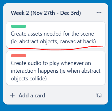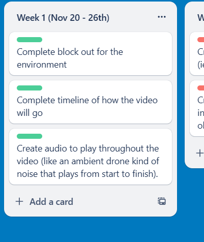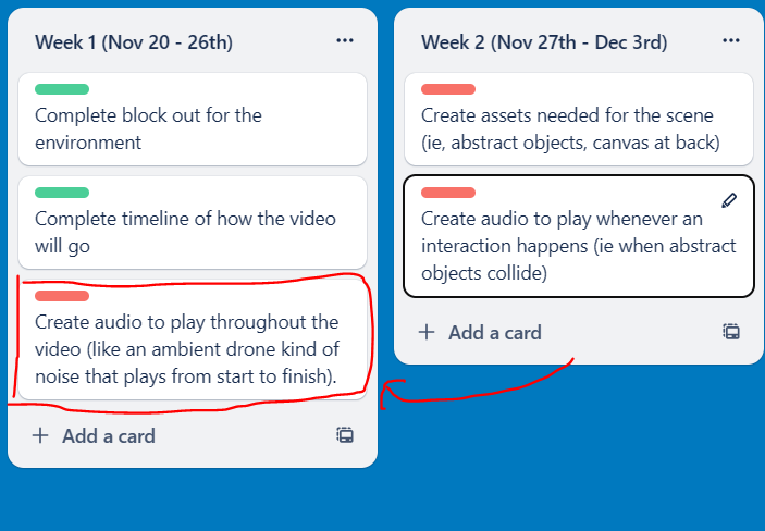 With the main body audio now done for the assignment, I updated the trello board to mark it as complete for the set of tasks for the first week.