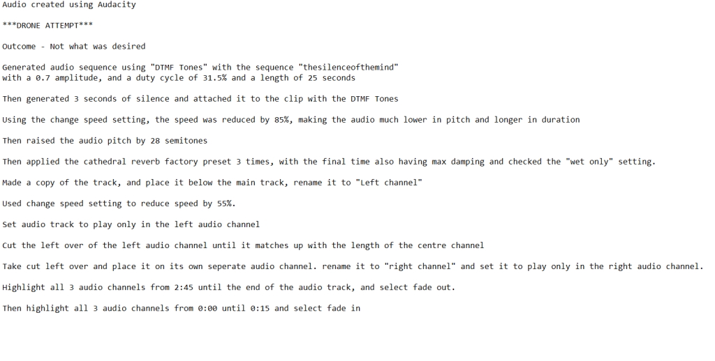 Creating the audio that would play throughout the entire project was something that I believed to be a crucial point in ensuring that it fit with the environment that I had. I preferably wanted to create the drone based audio on my own through the use of audacity, though my attempt turned out to be far from what I was hoping to make, though it did include some concepts that I did implement in future attempts. I will link the result of my first attempt below with the following instructions.