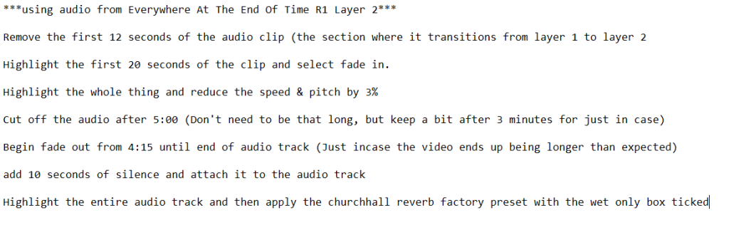 Whilst the end result wasn’t what I was hoping it to be, it was roughly on the right track of what I wanted in mind. It was at this point that I remembered about the album everywhere at the end of time, specifically, layer 2 of the last track, where it turns from a series of distorted sounds into an organ like drone. This drone organ, much like all of the other songs within the album (as well as the entirety of the caretakers discography), is sampled from an existing song and modified slightly in order to fit the nature of the album. The song used, is called “Präludium und Fuge in e-Moll / A Song of Sunshine” and is only slightly slowed down, and droned via reverb. This is how the track sounds in the caretakers album.