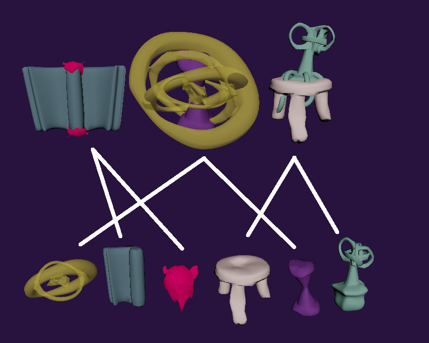 Each merged object would also have a few additional details added to each of them as to give the end result a more merged like result. For example, the plant and table like objects would be merged together, and the plant abstract object would grow into the table.