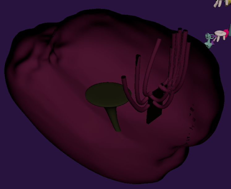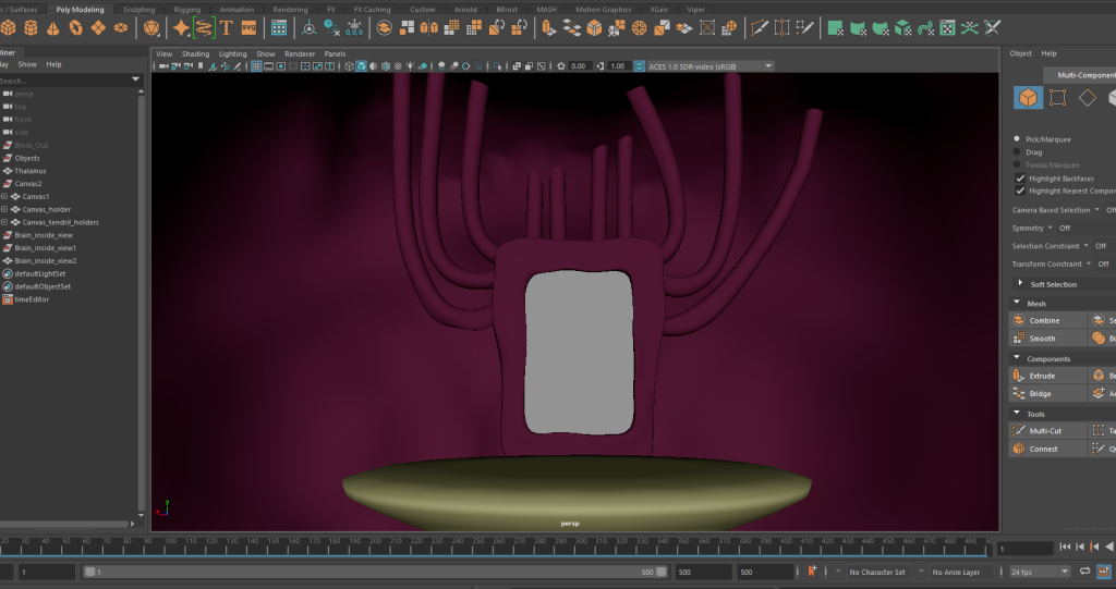 Now with the abstract and merged objects done, they were organised into the corresponding folders and work then began on the canvas that the final piece would be displayed. Though the work would be kept relatively simple since all that would be needed for the canvas section is to upscale it, give it a more organic like appearance, and then have a few tendrils attaches to it going upward as to make it look like it is attached to the back of the brain environment.