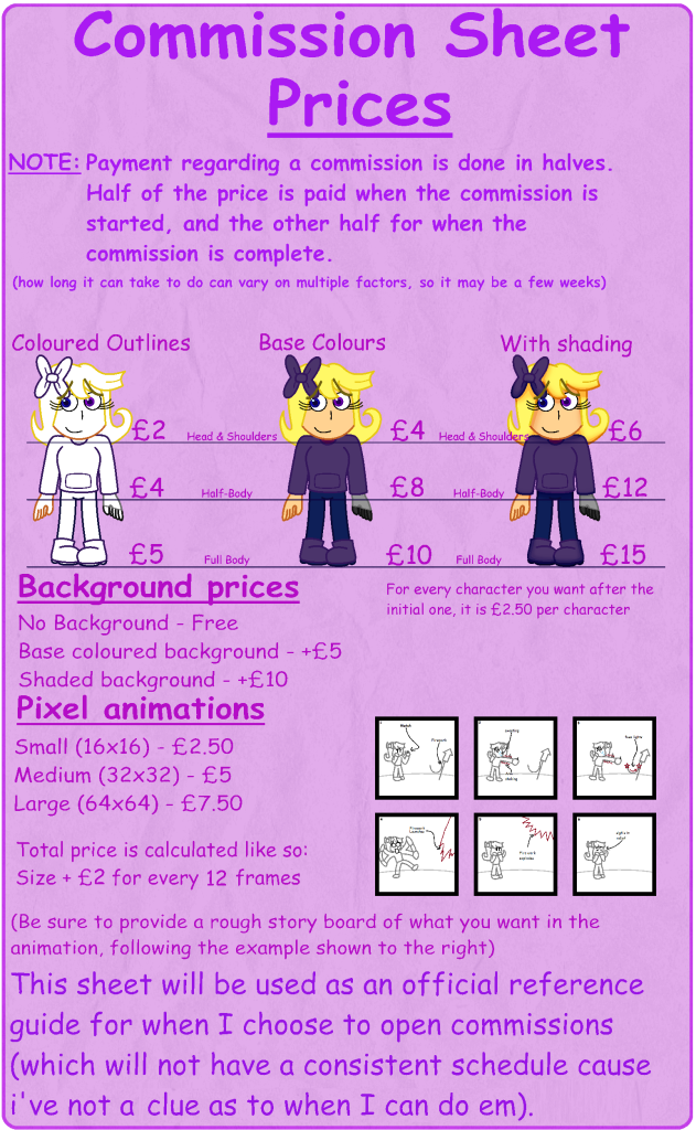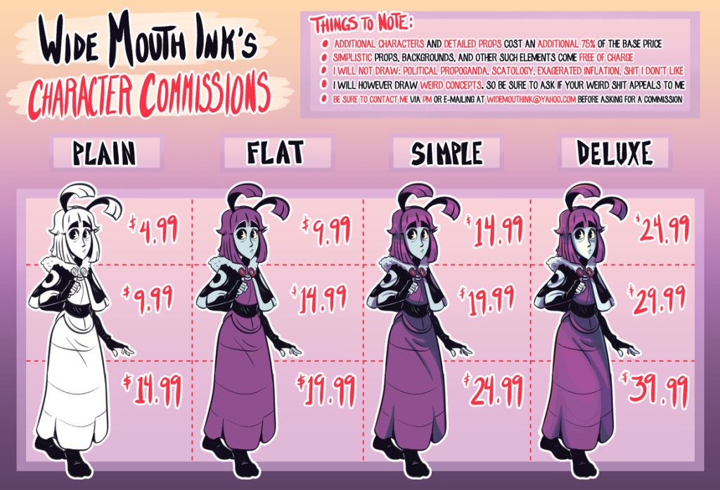 widemouththink (2019) A commission sheet to showcase their prices for creating freelance art for clients [Photograph] Available Online: Character Commission Sheet by widemouthink on Newgrounds