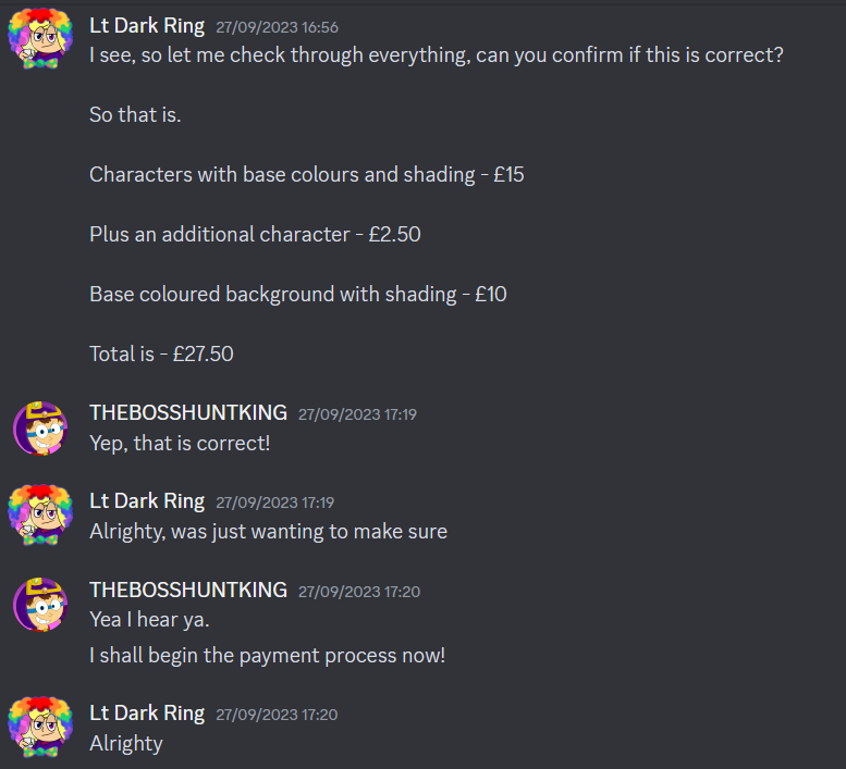 I also ask that if clients request a character that is not their own, that they get permission from the original owner if possible, as to avoid potential miscommunication, along with other complications down the line.