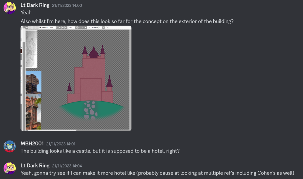For example, when designing concept art for a environment that was meant for an old fashioned hotel, I was given criticism in the form of the design looking too alike to that of a castle than an actual hotel. I took this feedback in mind, and redesigned the asset to more fit what the envisioned goal was.