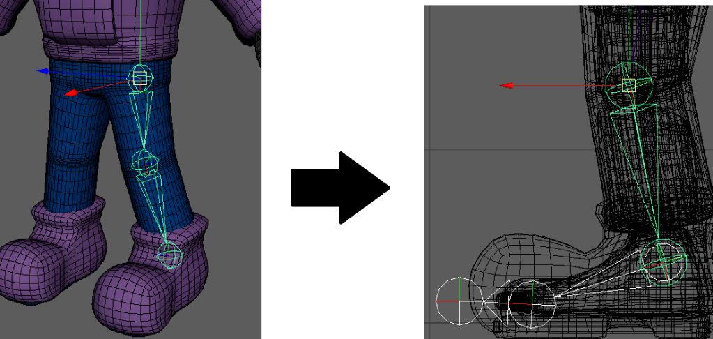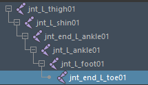 Next, the progress we did would then be mirrored onto the other leg. This would be done to both save time, as well as not having to go through the process of making an identical leg skeleton and risk it not being as precise as the other leg for the sake of consistency. The names of each of the joints were also changed and altered as to match the correct leg, and avoid consistency issues later on.