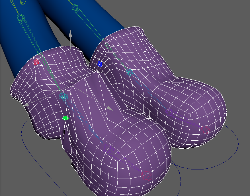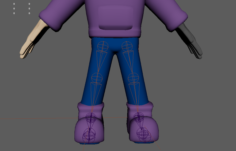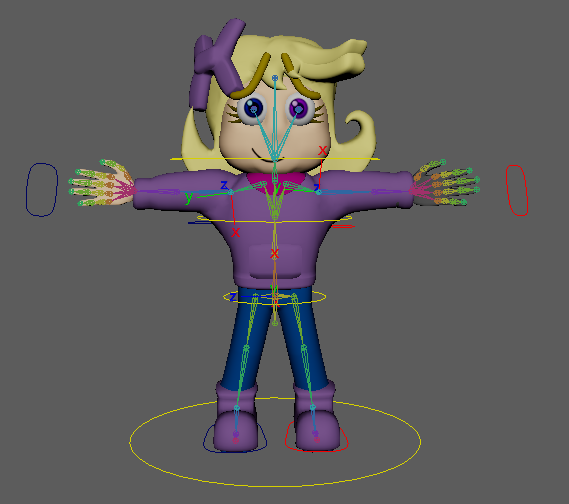 Controls were added both to the feet and hands, as to make them easier to locate, as well as control the animations for the model when needed (as opposed to just constantly going into the skeleton folder and grabbing the IK handles every time).