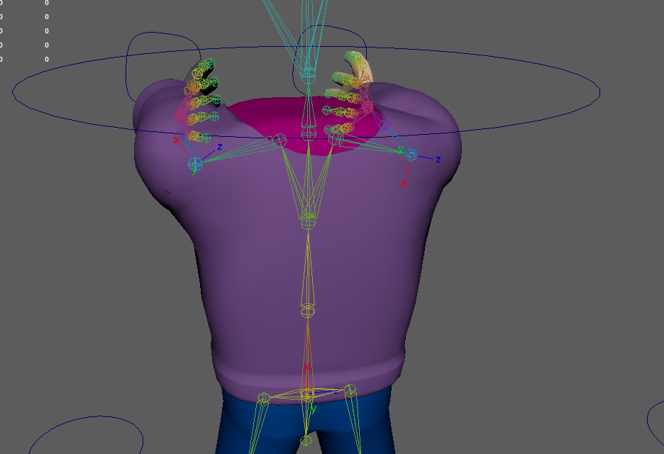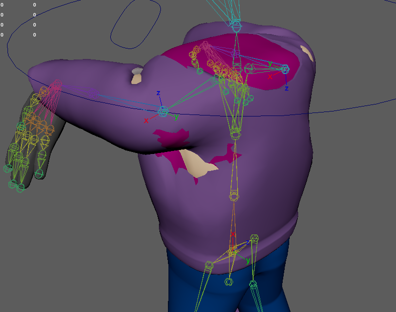 Though now would come the most tedious part of the weight painting process, the fingers. This was especially difficult, not only because each of them were so close together (making the whole process difficult to navigate between them). This part of the weight painting process took place over the course of several days and nights, due to the process requiring multiple takes in making sure each finger moved correctly and didn’t deform too much.)