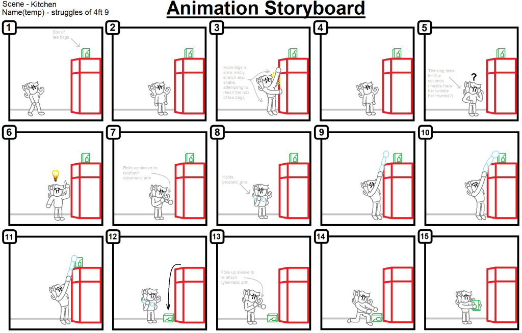 This 15 panel story board, depicts Urti struggling to reach a box of tea bags that have been placed on top of the fridge, before getting the idea of removing her cybernetic arm to use as a way to extend her reach, and knock them off the fridge within reaching distance.