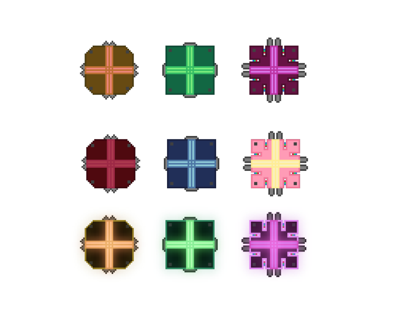 Swiftly, these 9 designs were conjured up for one of the tiles, in a pixelated style scaled up by 4 times as to allow the image to easily be viewed. 3 designs were made, consisting of a different base, with different end pieces on each side, which were then duplicated into a 3 by 3 grid, with various tests in terms of designs, which provided the following the results.