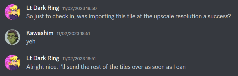 The implementation of the tiles was proven to be a success, though the team request for the tiles in a large upscaled form, as to avoid graphic complications down the line. Wanting to ensure that the tiles were at a high enough resolution for the team to use, I took the base size of each tile (most of which on average were about 35 by 35 pixels, and upscaled them by 20x, making them 700 by 700. Their design remained the same in terms of a pixelated form, though it was now scaled up for the team to use efficiently for their needs.
