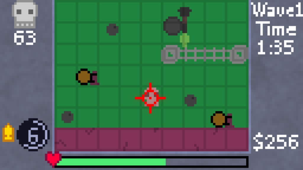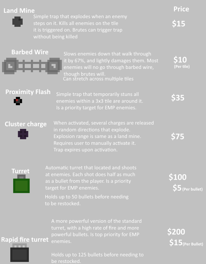 The player has 2 ways of killing them, either through shooting the enemies by clicking on them, or if the enemy triggers a trap meant to kill them (such as a landmine for example). The enemies will at first die relatively easily, though overtime, tougher enemies will show up, requiring more bullets/traps to kill.