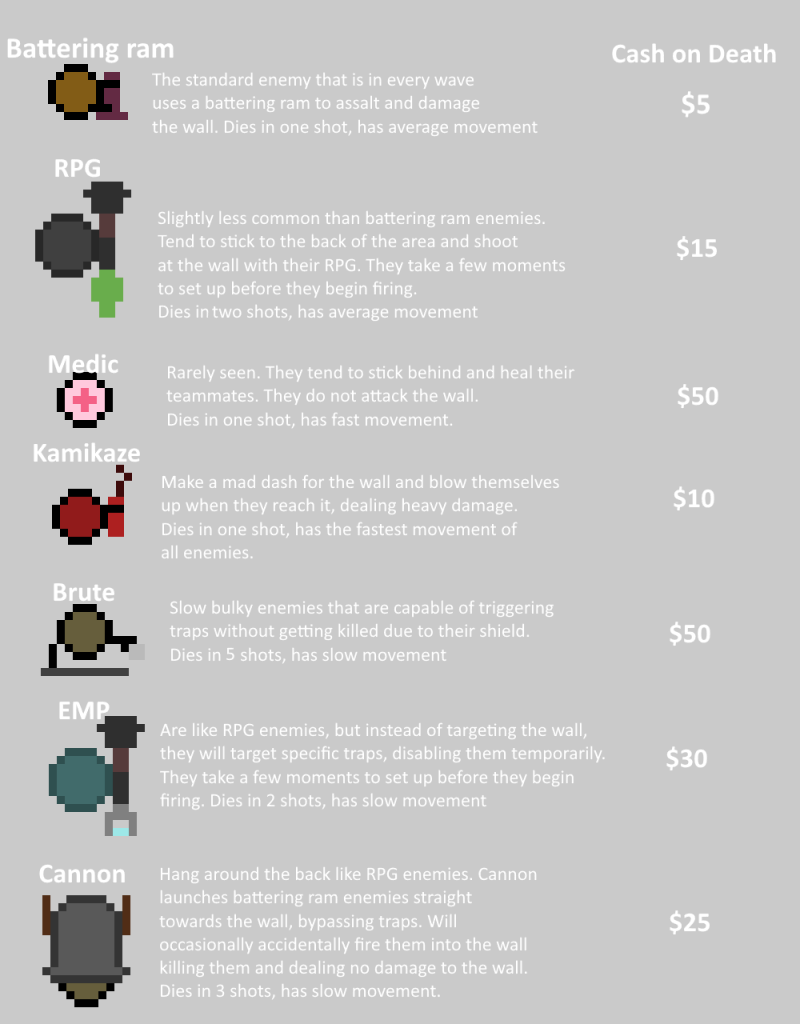 Enemies would come in from the top of the screen, and depending on what type of enemy they are, would either walk straight towards the wall to damage it, or hang back and destroy the wall from afar using their weapons.