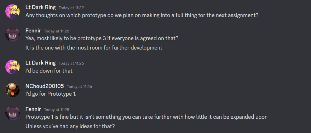It would also be around this time that we started considering the idea for which of the 3 would be our main prototype that we would develop into a full project. Whilst several smaller discussions had occurred over the course of the past few weeks, no one within the team had an official answer (Likely because at the time, we were all heavily focused on the presentation at the time, rather than the actual games themselves.