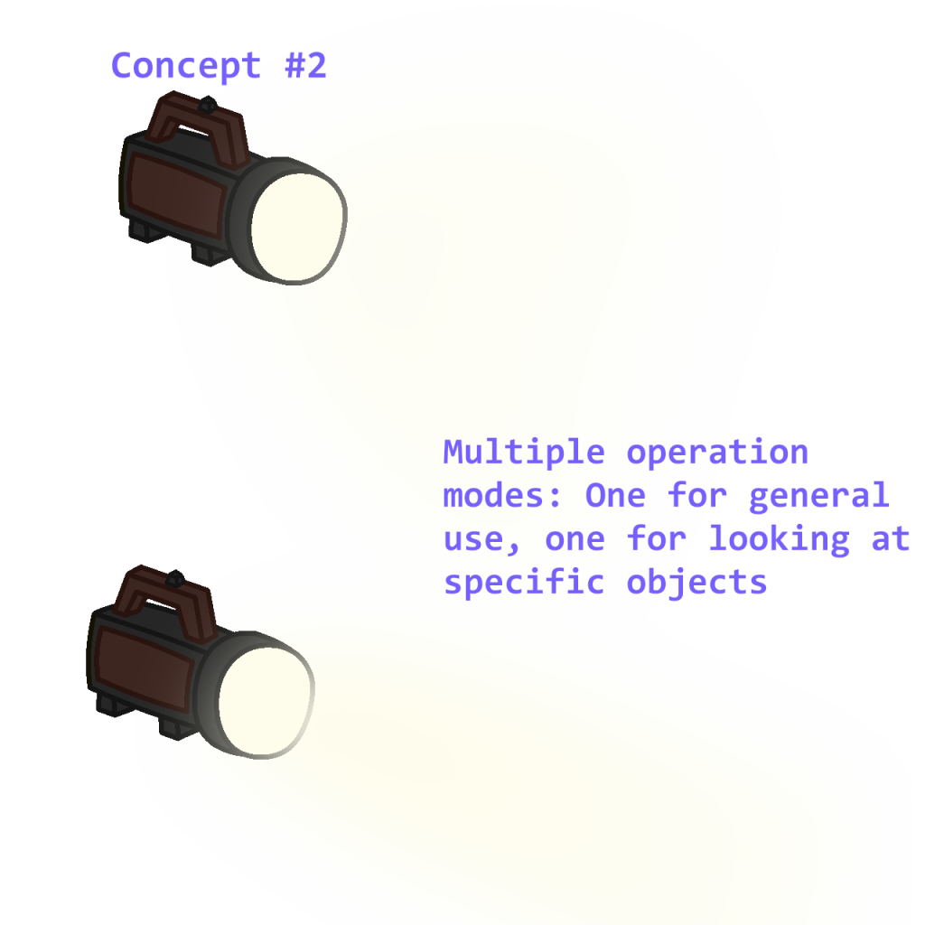 Since they had not specified any specific objects that were needed at that current moment in time, I decided to expand on my concepts for flashlight operating modes to deliver to the team that could be used to make into potential game mechanics.