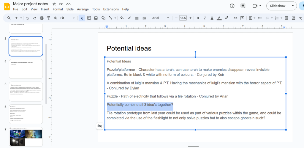 The first would be a google slides file that each of us could contribute to at all times, and would be the main way that we would put idea’s and suggestions down onto the table.