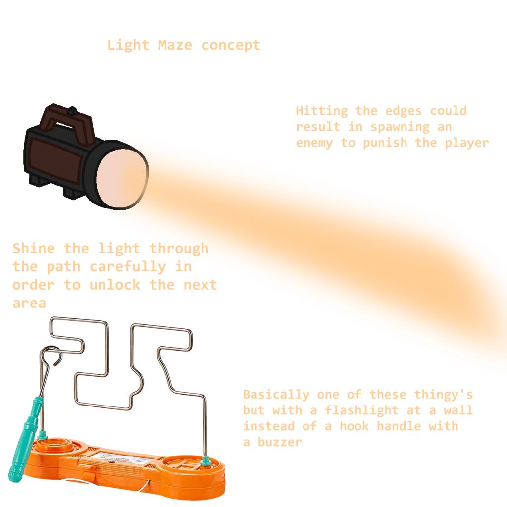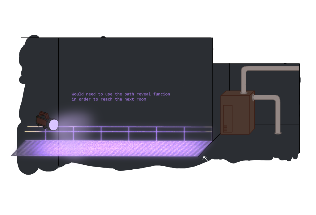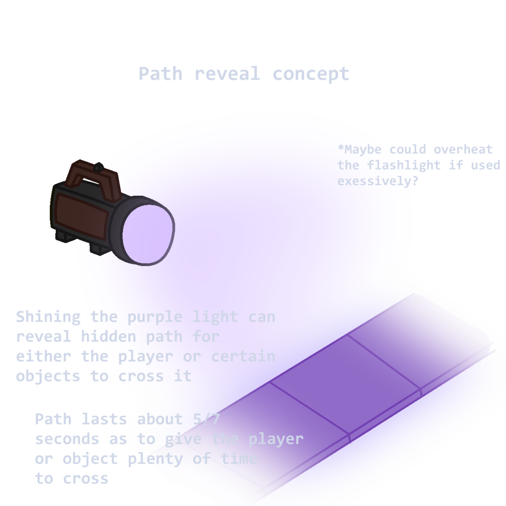 At the time, I already had 3 different concepts for operation modes for the flashlight, including the standard mode where the flashlight would act normally. These operation modes would include, a purple light which would be used to real hidden pathways for the player to cross.