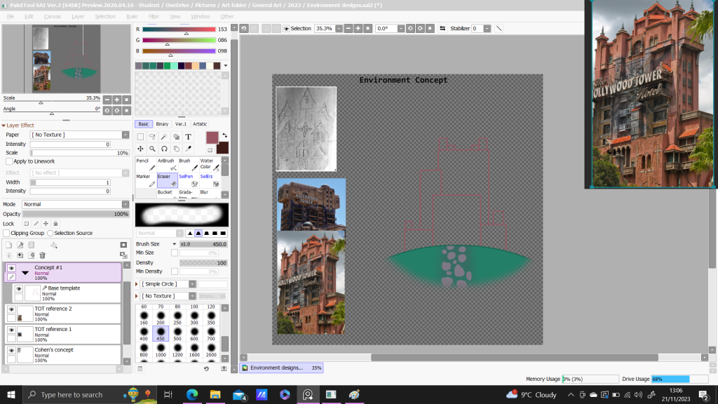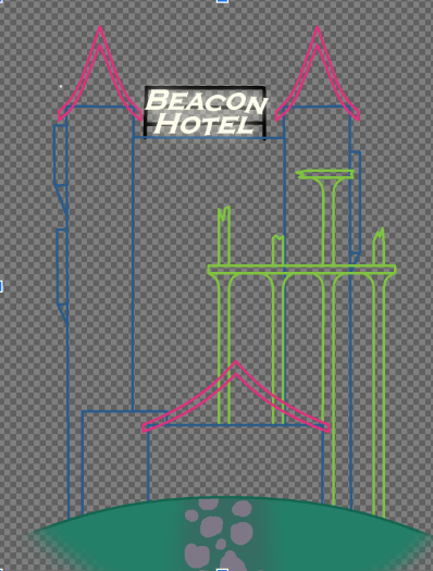 With these notes in mind, I took the concept art back into SAI, and began to refurbish and change the design to more closely resemble a hotel. I decided to also at the same time, expand my range of reference images by looking up pictures of 1930’s to 1950’s hotels as inspirations alongside the reference images of the tower of terrors that I already had, and made major revisions to the visual design of the hotel, though I did take a few design aspects from the old design as to implement them into the new one.