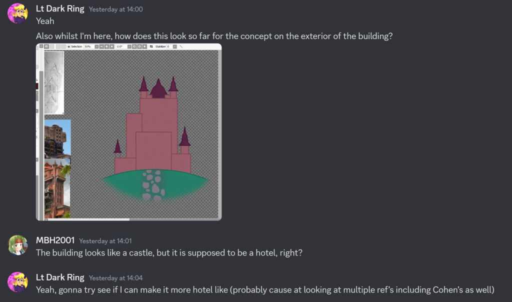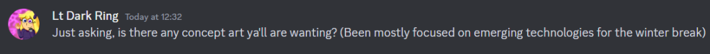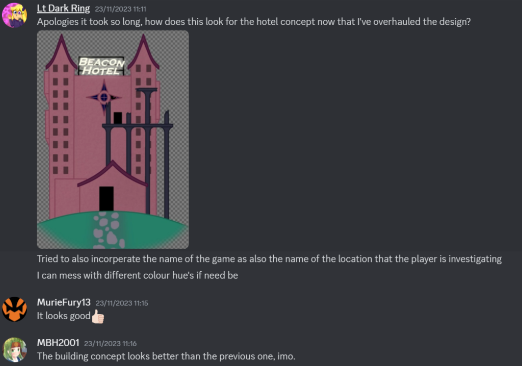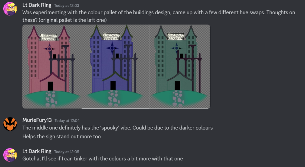 The other would be a discord group chat where can more directly communicate with each other on the idea’s in question, either when it came to discussing what idea’s were placed onto the table, or for if something came up which may impact the work process later on down the line.