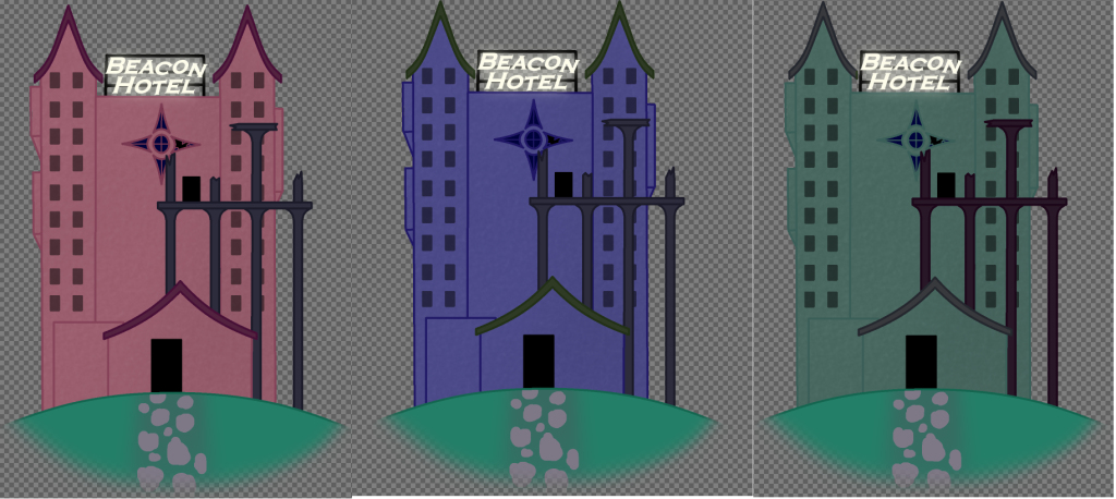 The team had expressed immense interest in the middle colour pallet, and so I decided to make a duplicate of the building and shift the colour pallet of it to be a noticeably darker version of itself, along with a few minor adjustments (such as making the general darker layer have slightly less opacity as to have more of an affect on the overall colour pallet of the building. After a few minutes of doing some slight hue shifts, along with some colour tweaking, I was able to conjure the following result.