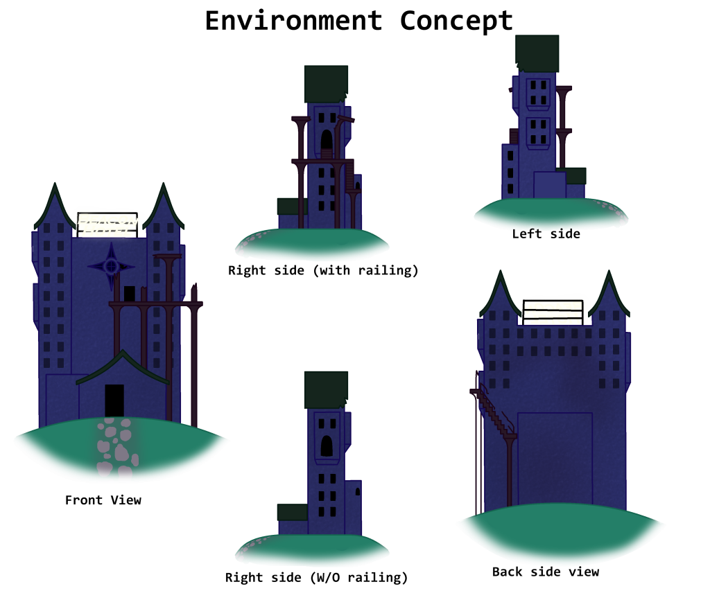 Overall, I am rather proud with how these concepts came out, even if the side views did end up being slightly shorter than the front and back concepts creating a slight discrepancy in terms of height. I sent them over to the team, and then began work on concept art for the interior designs of the hallways and rooms.
