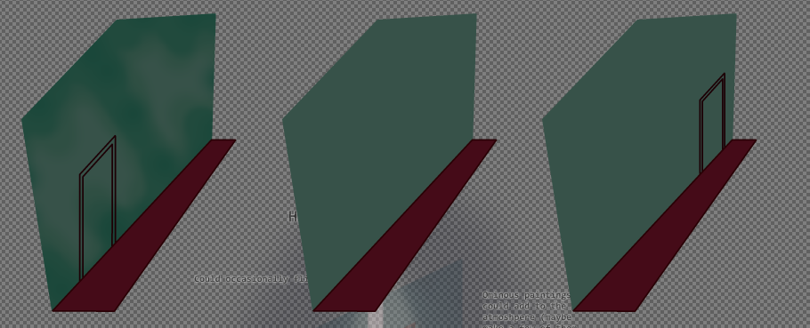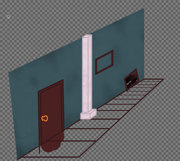 I began with a rough drawing of the hallway similar to what I had done with that personal pixel animation I did of mine, but with a few minor changes as to experiment with the overall flow of the design a bit, most notable the flipped positions of the door and the paintings.