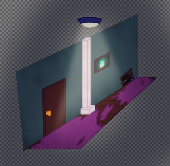 This finalised piece of the hallway concept would be sent off to the team for feedback whilst I began work on another concept, this time for one of the hotel rooms, where it would compose of a simple design to use as a baseline for all of the other room concepts, since the concept will have the room be portrayed in 2 different forms, a normal unhaunted state, and a haunted state that depicts an enemies presence within the room.