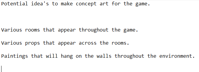 With the lack of a proper answer from the team, I decided to take matters into my own hands, and begin writing a note pad list of potential pieces of concept art that I could work on, before getting to work on the next piece of concept art.